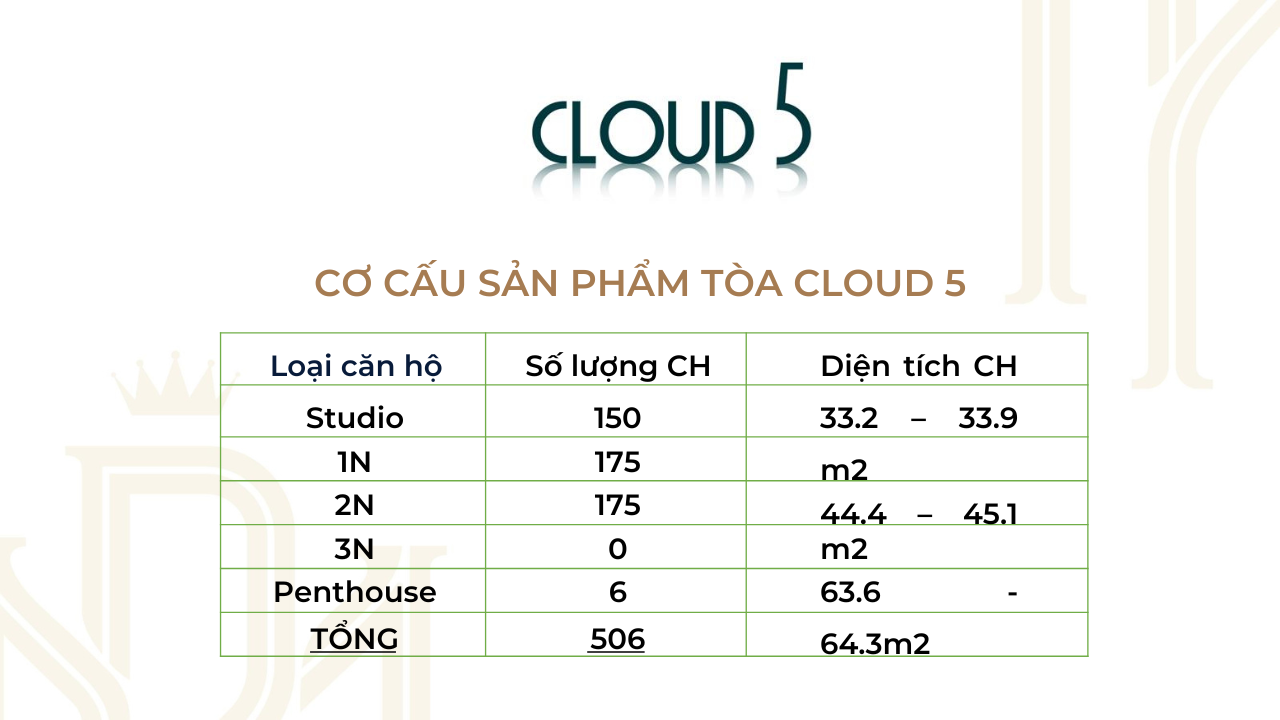 Căn studio có diện tích 33.2 đến 33.9 m .Mã căn CH 02-05-11-12-17-19