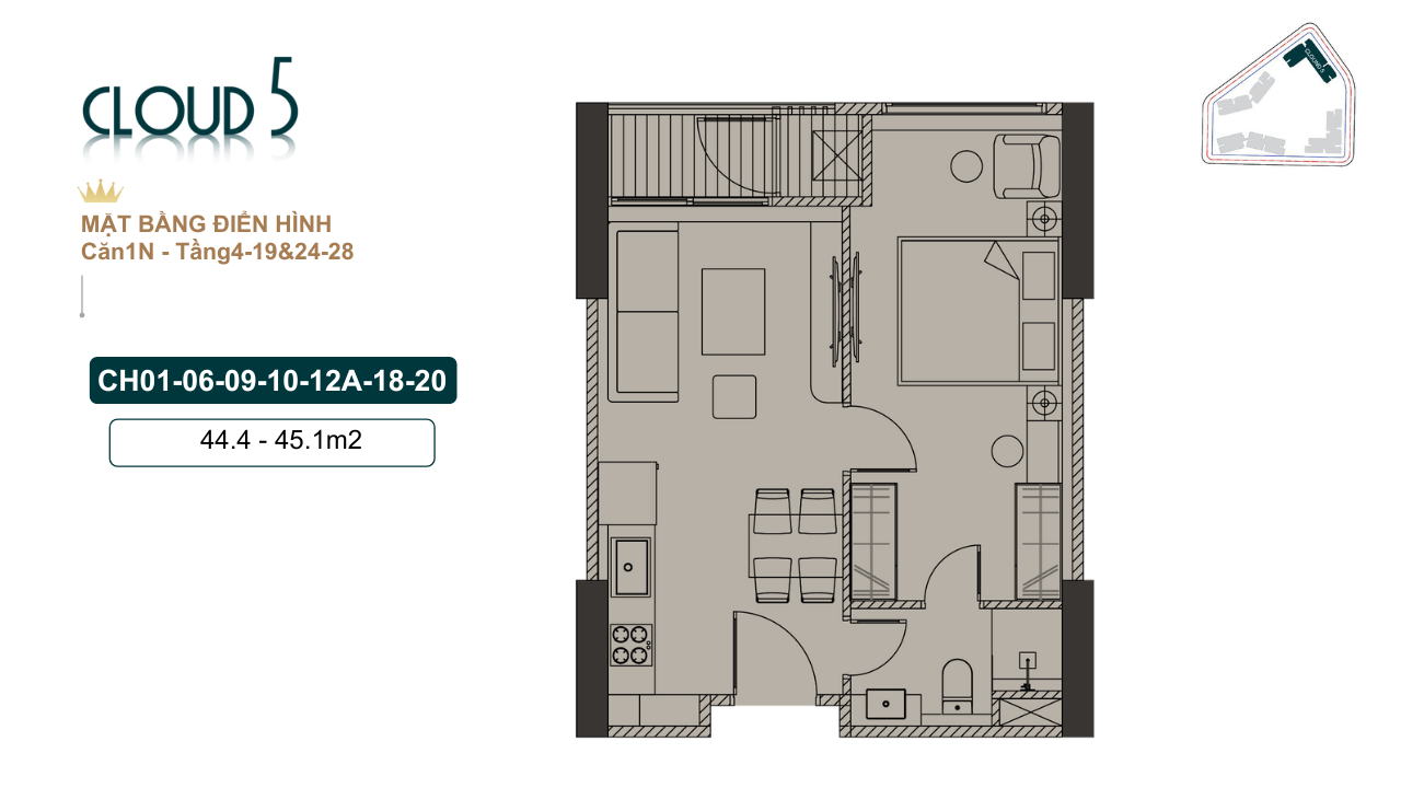 Tổng mặt sàn tầng 4-19 và 24 -28 một mặt sàn tổng 20 căn hộ .Tổng có 6 căn studio ,căn 1 ngủ có 7 căn hộ ,căn 2 ngủ tổng 7 căn