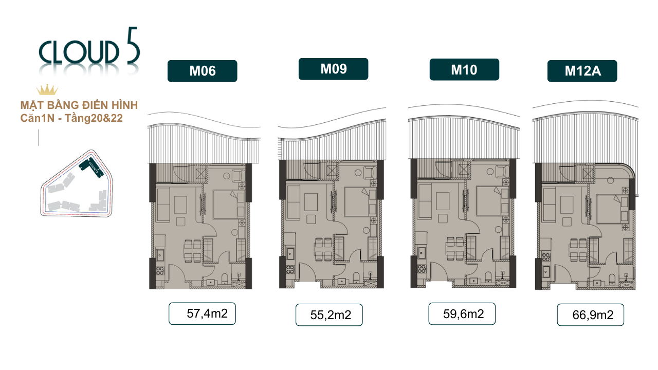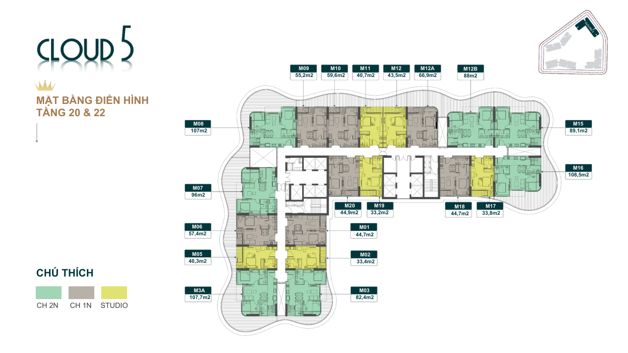 Tổng mặt sàn tầng 4-19 và 24 -28 một mặt sàn tổng 20 căn hộ .Tổng có 6 căn studio ,căn 1 ngủ có 7 căn hộ ,căn 2 ngủ tổng 7 căn