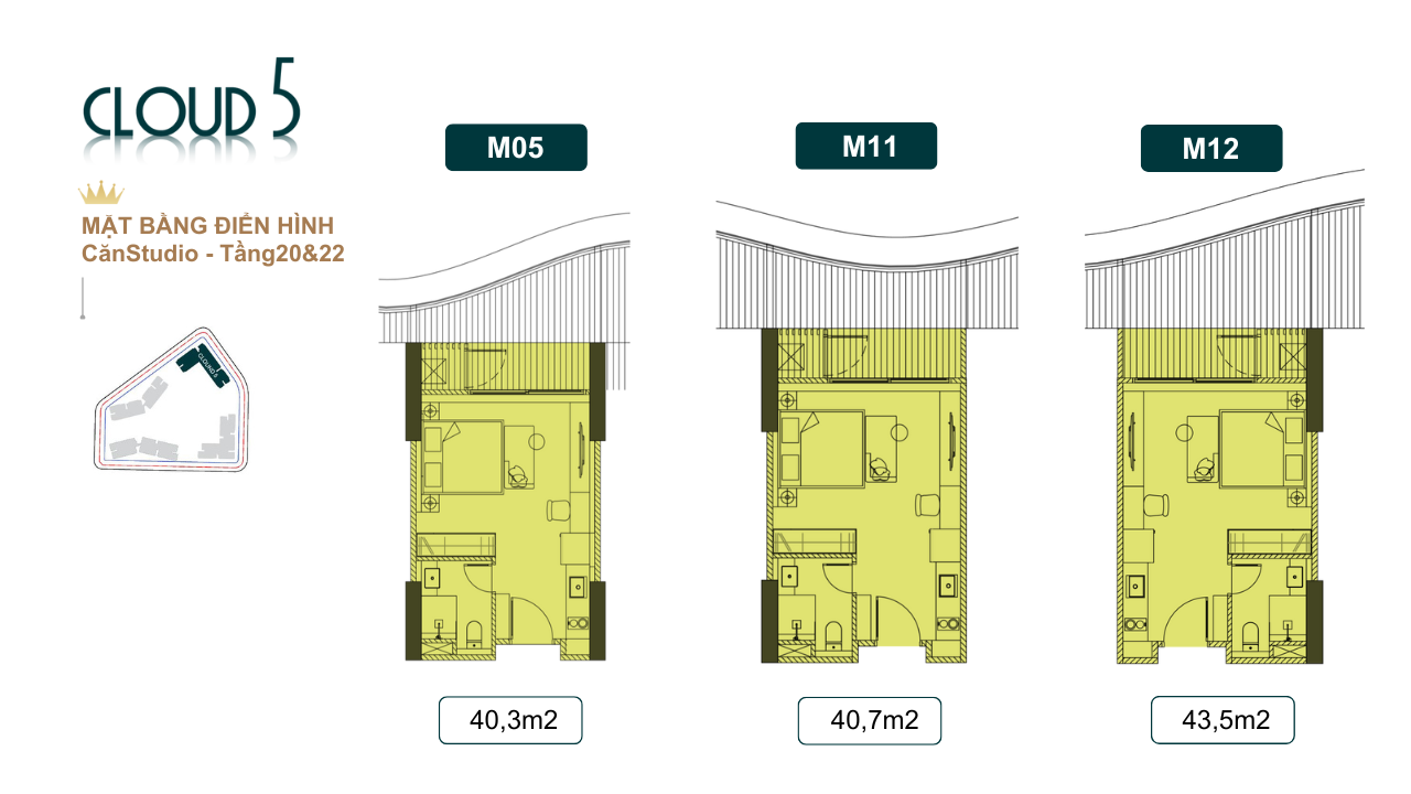 Căn studio có diện tích 33.2 đến 33.9 m .Mã căn CH 02-05-11-12-17-19